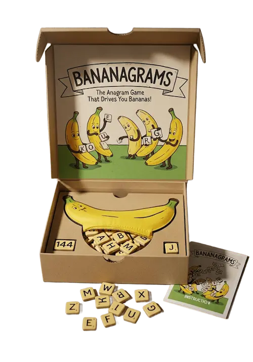 BANANAGRAMS es un juego de mesa lleno de acción pensado para jugar de forma rápida y creativa. Perfecto para familias, profesores o quienes sean aficionados a las palabras. Es una alternativa ideal para quienes quieran juegos diferentes de palabras cruzadas, pero sin tableros.