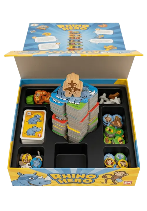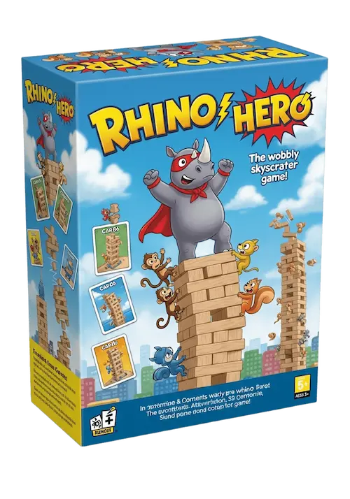 Rhino Hero es un tipo de juego de mesa lleno de acción y muy divertido. Pensado tanto para las familias como para los niños, cada sesión se convierte en un desafío único. El objetivo es la construcción de torres lo que hace que aparezcan las risas y el suspense.
