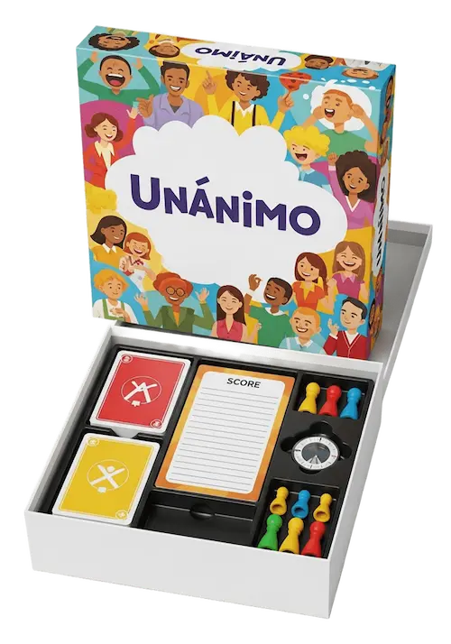 Unánimo es un juego de mesa muy social que tiene como objetivo que los jugadores se conecten y piensen en grupo. La idea es jugar con la psicología de grupo y la asociación de palabras, lo que lo hace perfecto para todo tipo de grupos.